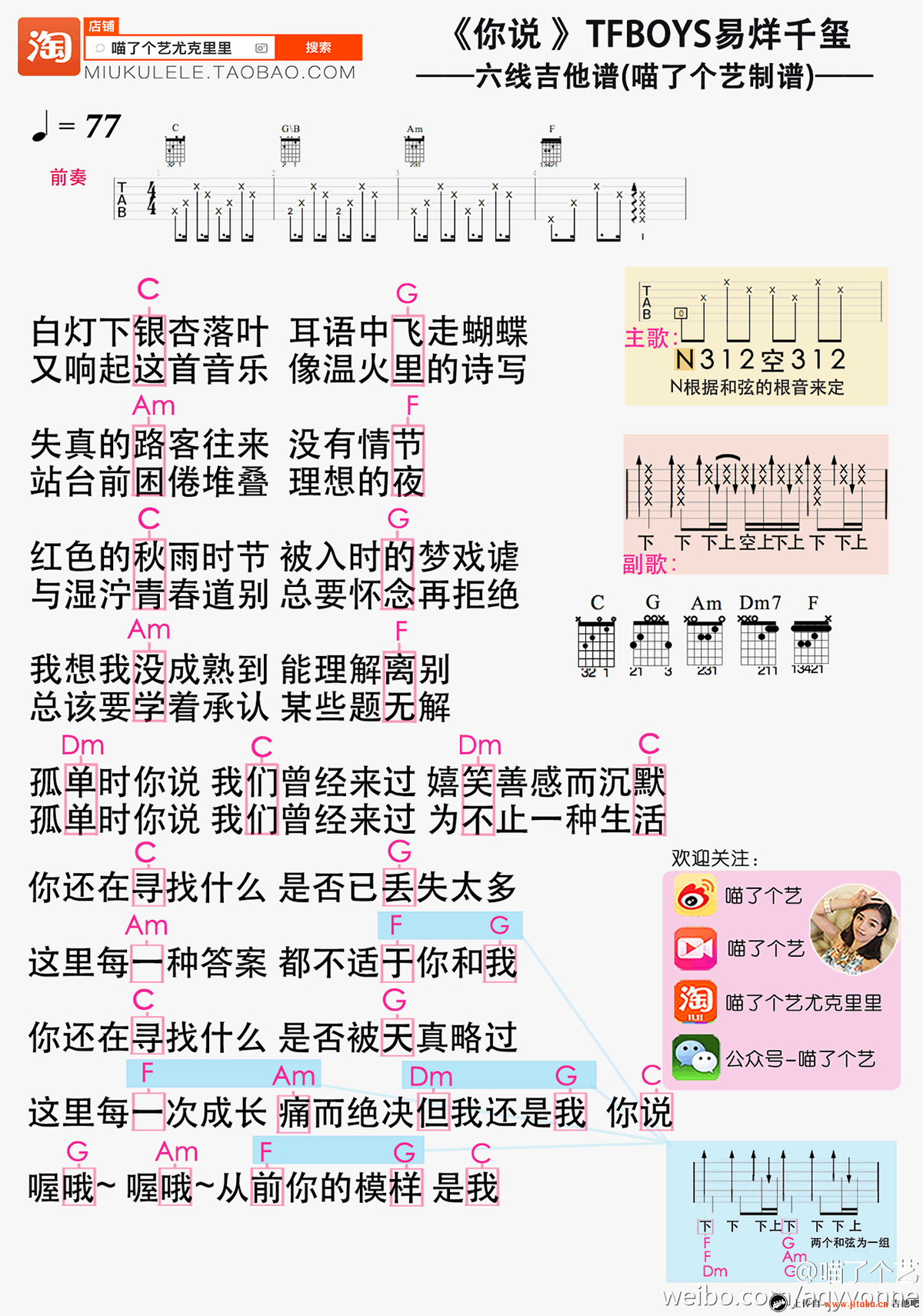 易烊千玺新歌,你说吉他谱,TFBOYS易烊千玺的《你说》。曲谱带前奏,和弦按法、节奏型参考图片标注。...