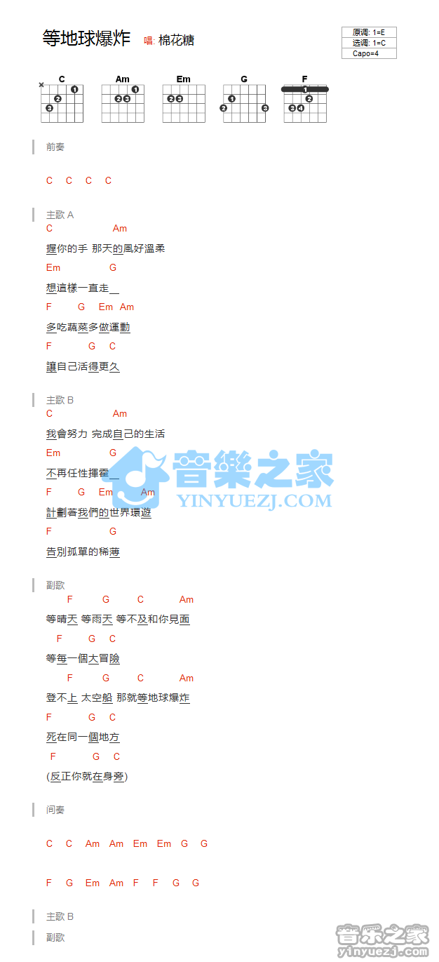 棉花糖《等地球爆炸》吉他谱,YYZJ编配出品,共有1张高清图谱,免翻页排版设计。...