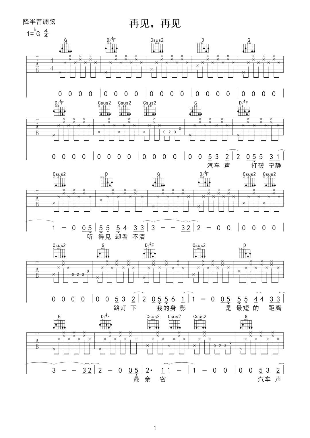 逃跑计划《再见再见》吉他谱,革命吉他编配出品,共有3张高清图谱。...