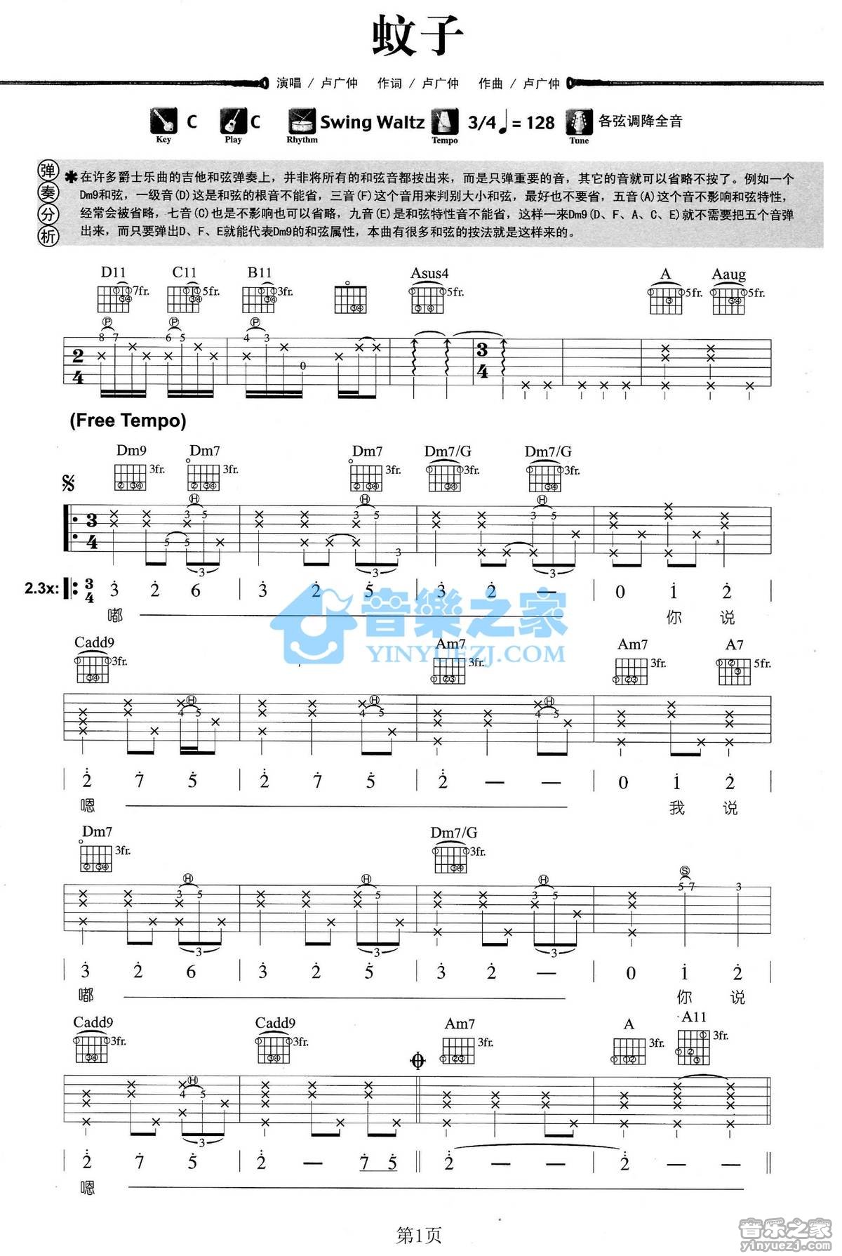 吉他卢广仲《蚊子》吉他谱 - 很多人都在弹的版本