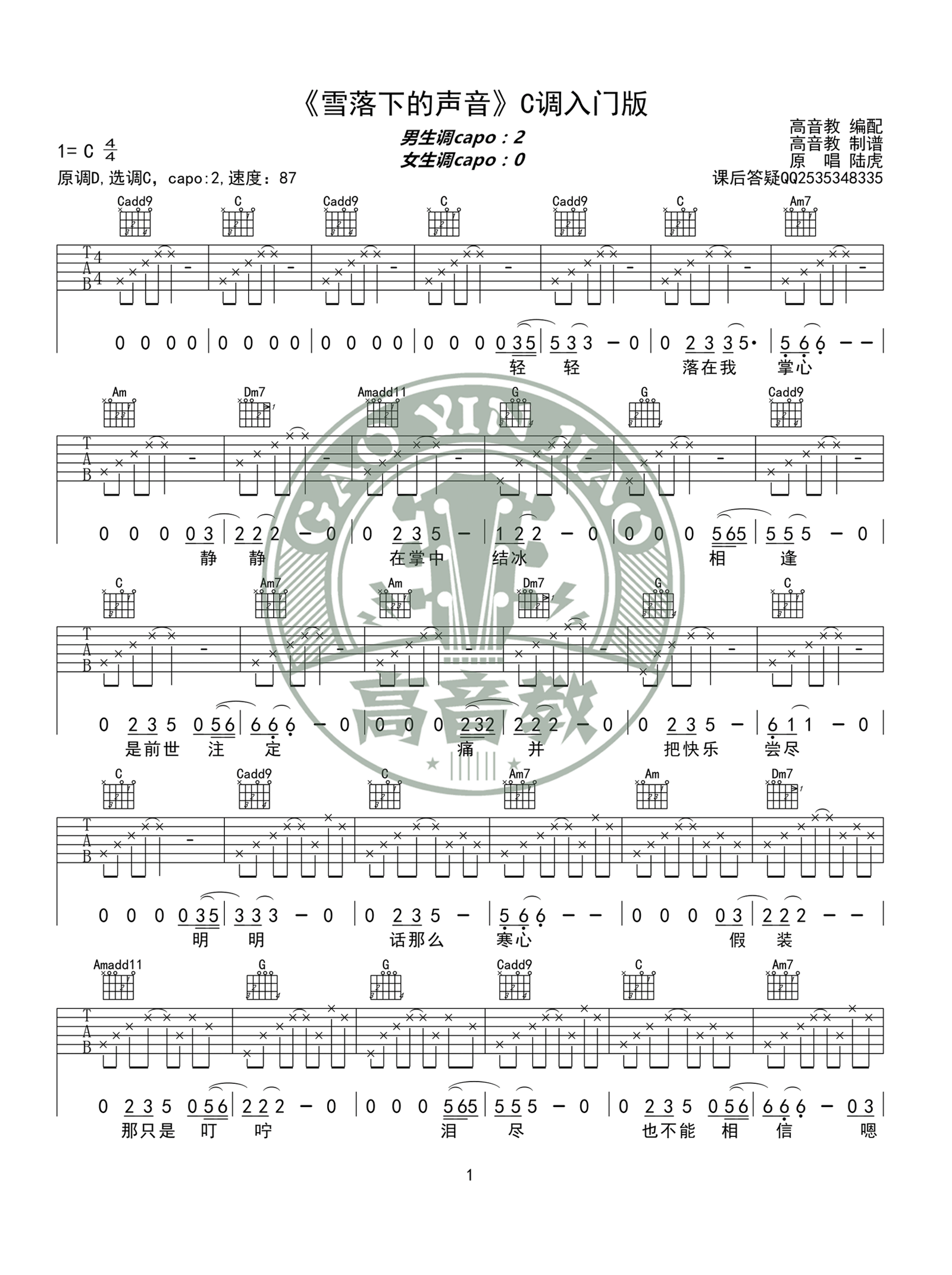 吉他陆虎《雪落下的声音》吉他谱 - 非常多人都在弹的版本