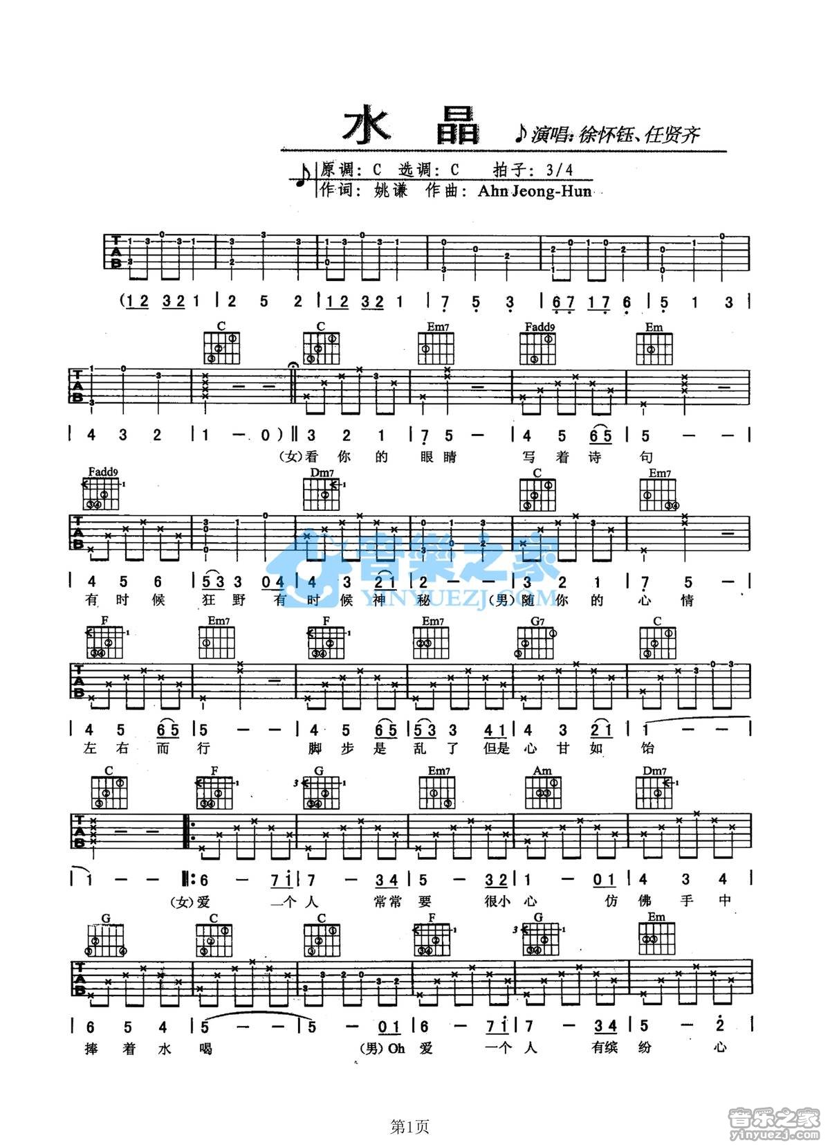 吉他徐怀钰/任贤齐《水晶》吉他谱 - YYZJ编配