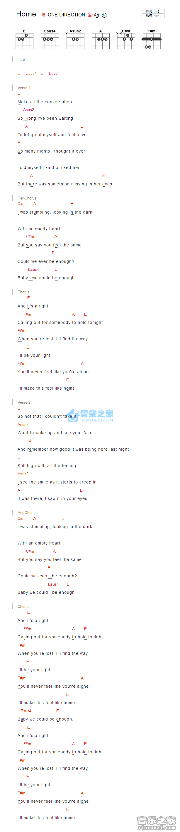 E调版OneDirection《Home》吉他和弦弹唱谱...
