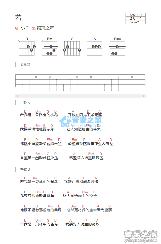 C调版基督教歌曲《若》吉他和弦弹唱谱...