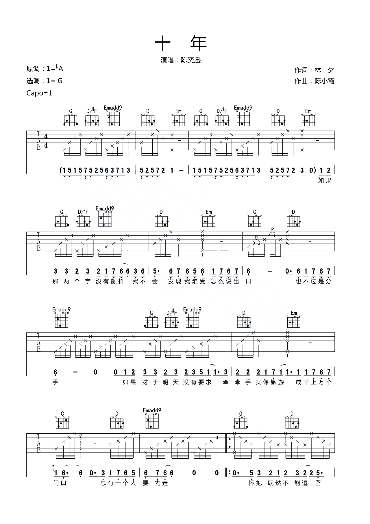 陈奕迅《十年》吉他谱_G调吉他弹唱谱...