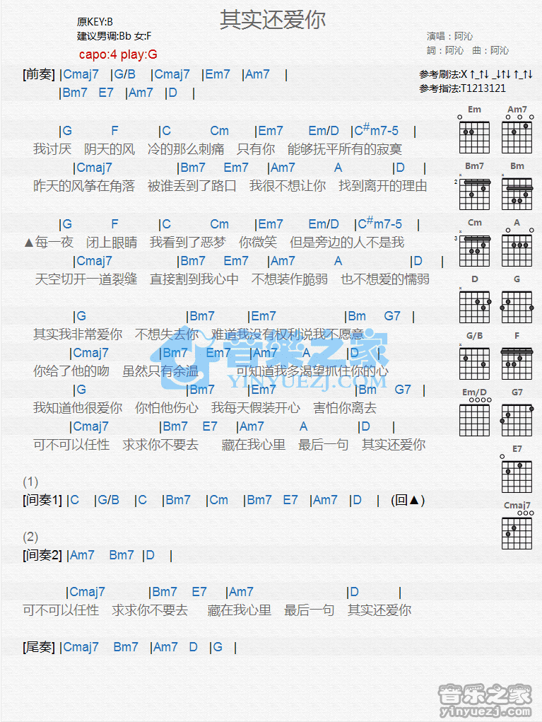 G调版阿沁《其实还爱你》吉他和弦弹唱谱...