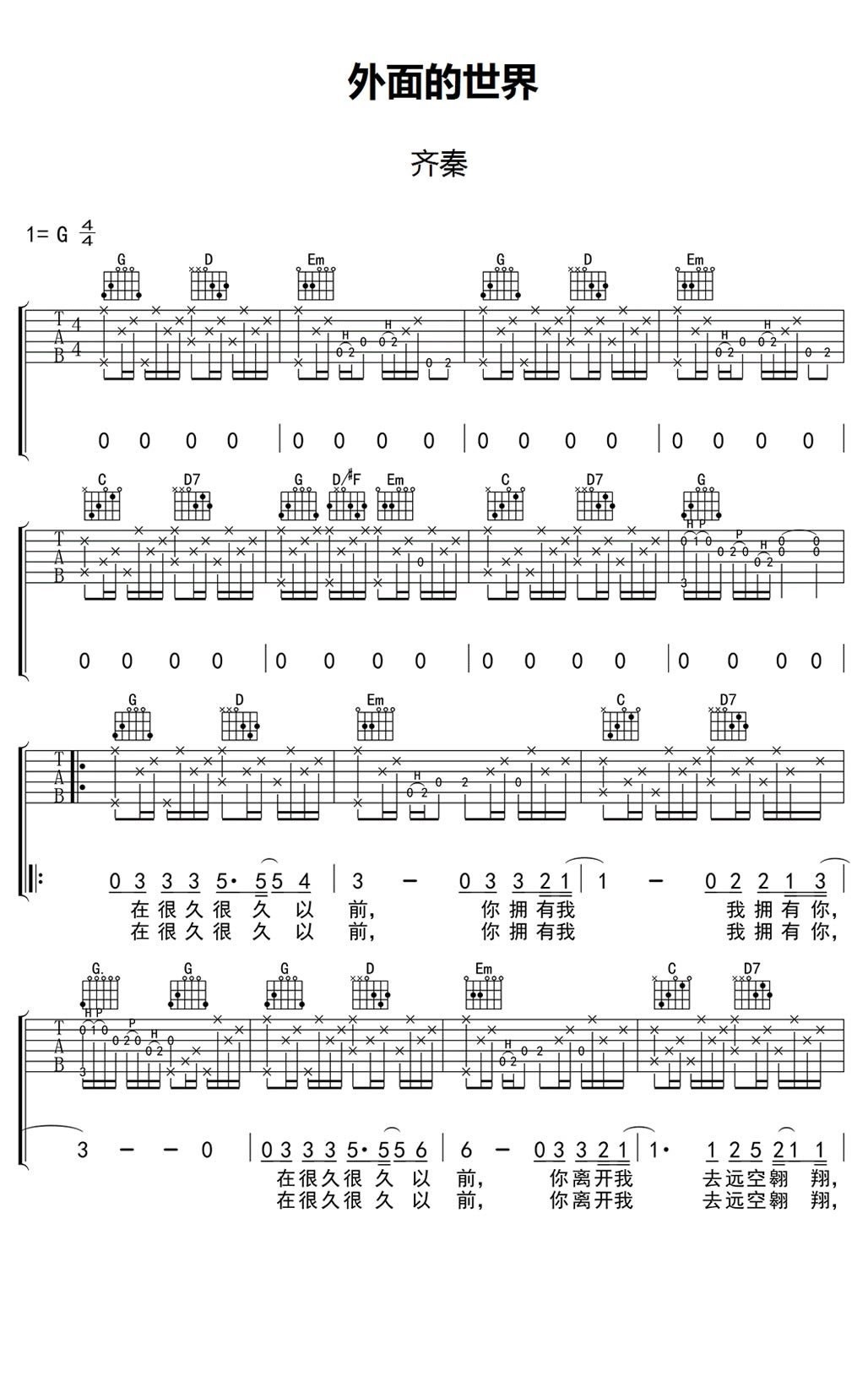 齐秦《外面的世界》吉他谱完整男生版外面的世界吉他六线谱(女生调夹四品)...