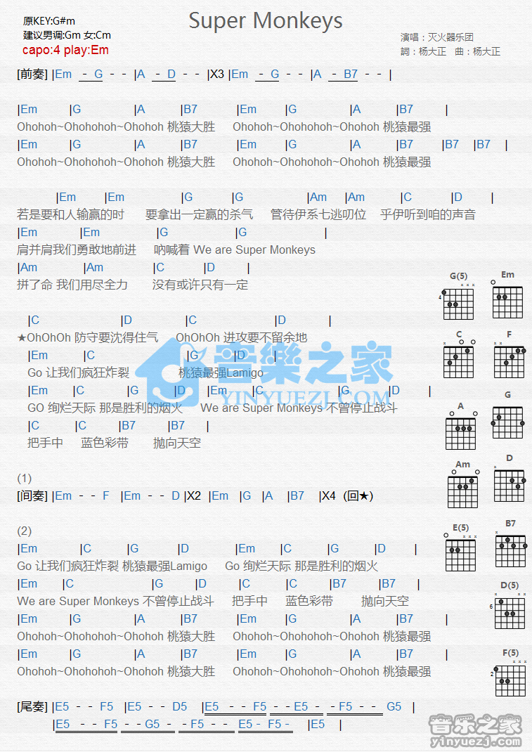 Em调版《SuperMonkeys》吉他和弦弹唱谱...
