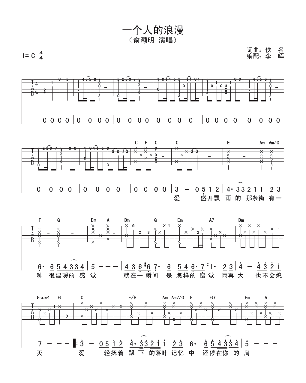 俞灏明《一个人的浪漫》吉他谱,李晖编配出品,共有2张高清图谱,免翻页排版设计。...