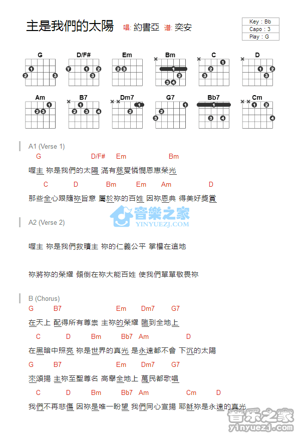 G调版约书亚《主是我们的太阳》吉他和弦弹唱谱...