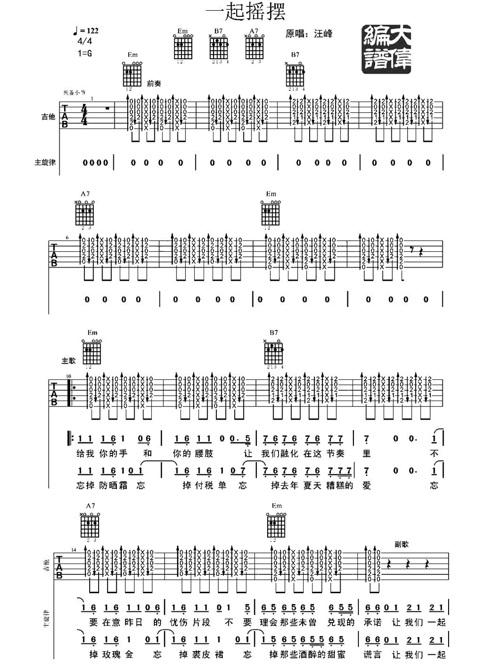 吉他汪峰《一起摇摆》吉他谱 - 非常多人都在弹的版本