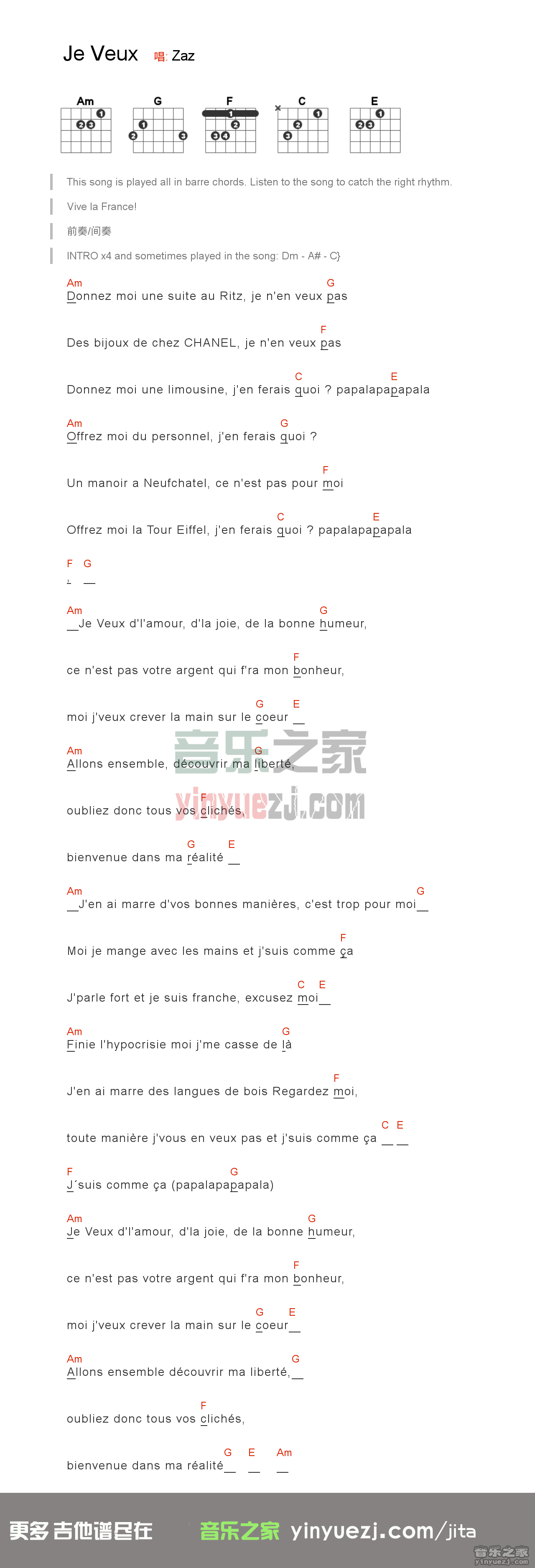 zaz《jeveux》吉他谱,YYZJ编配出品,共有1张高清图谱,免翻页排版设计。...