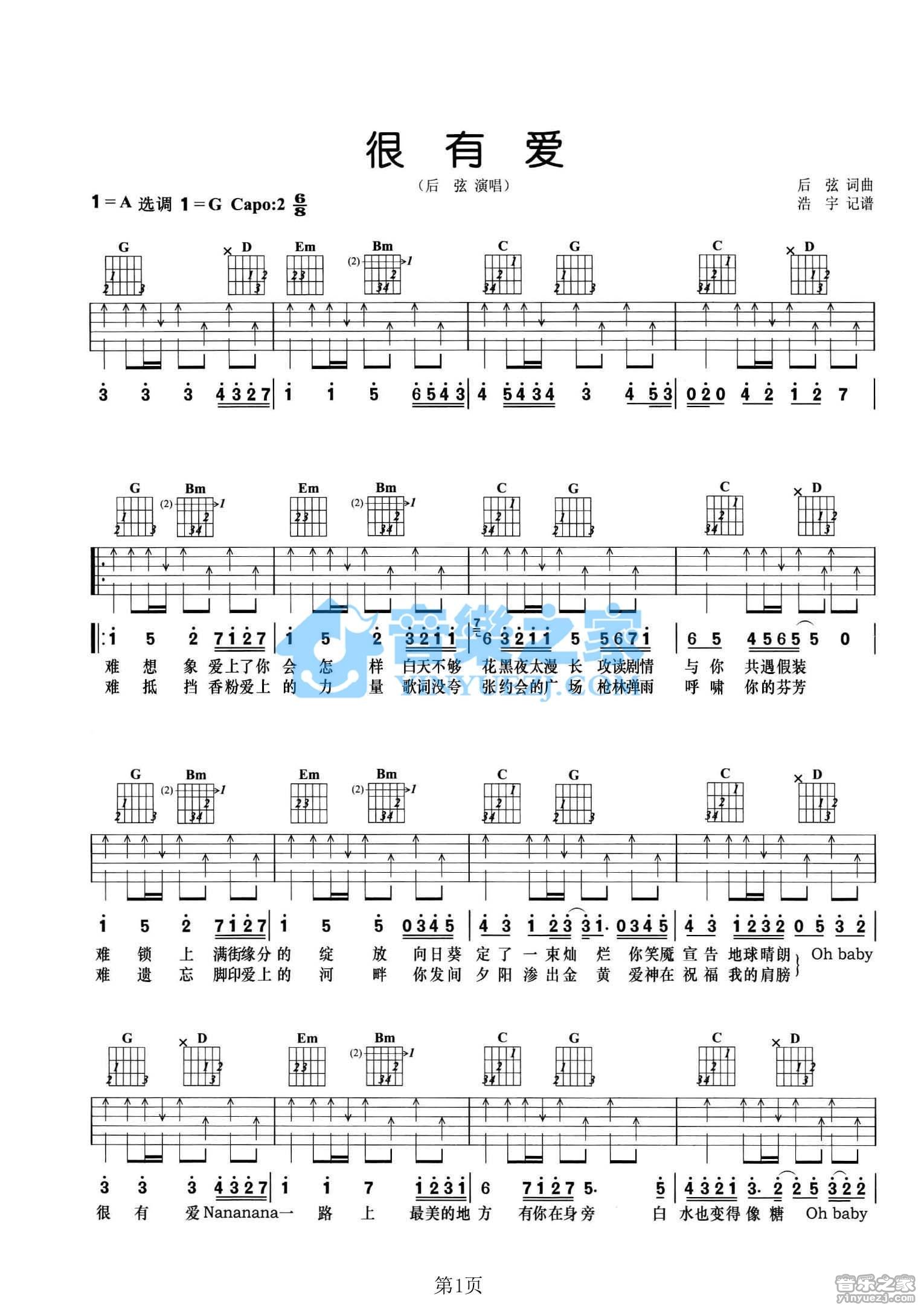 G调版后弦《很有爱》吉他弹唱六线谱...