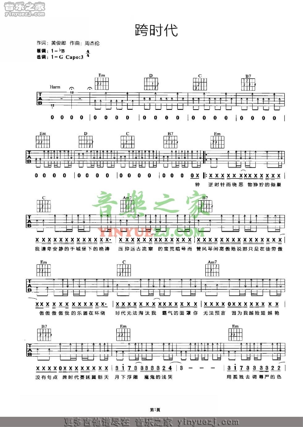 周杰伦《跨时代》吉他谱,YYZJ编配出品,共有2张高清图谱,免翻页排版设计。...