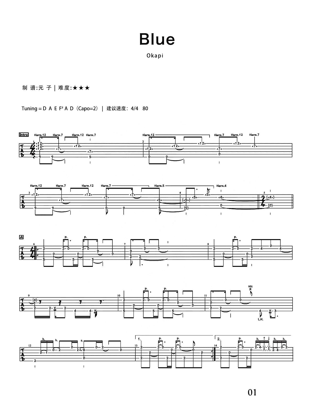 Okapi《Blue》吉他谱,元子编配出品,共有6张高清图谱。...