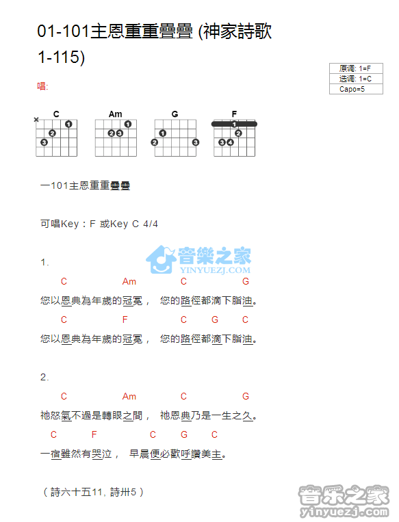 C调版神家诗歌01-101《主恩重重叠叠》吉他和弦弹唱谱...