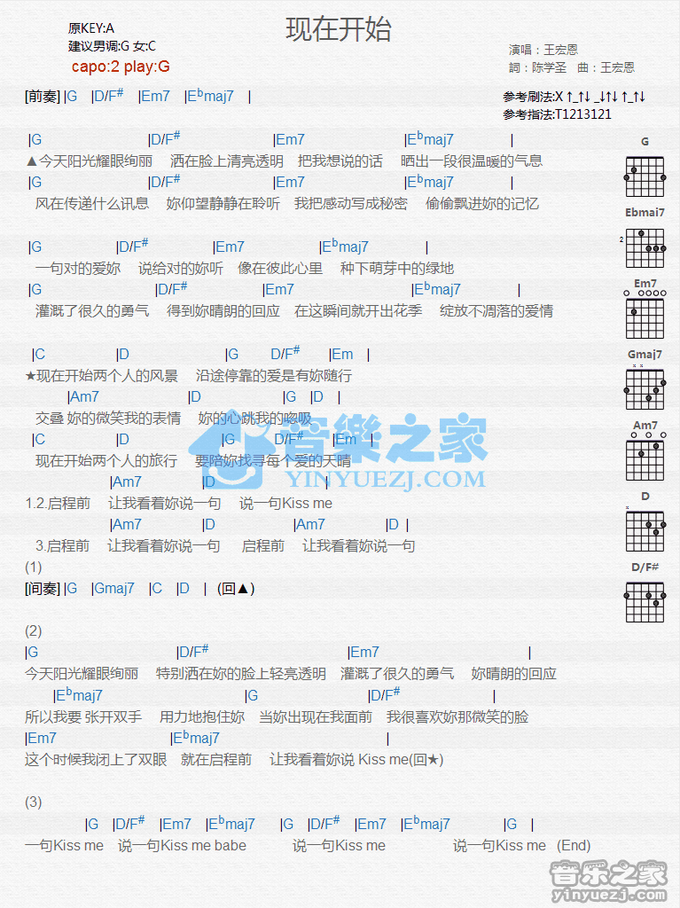 G调版王宏恩《现在开始》吉他和弦弹唱谱...
