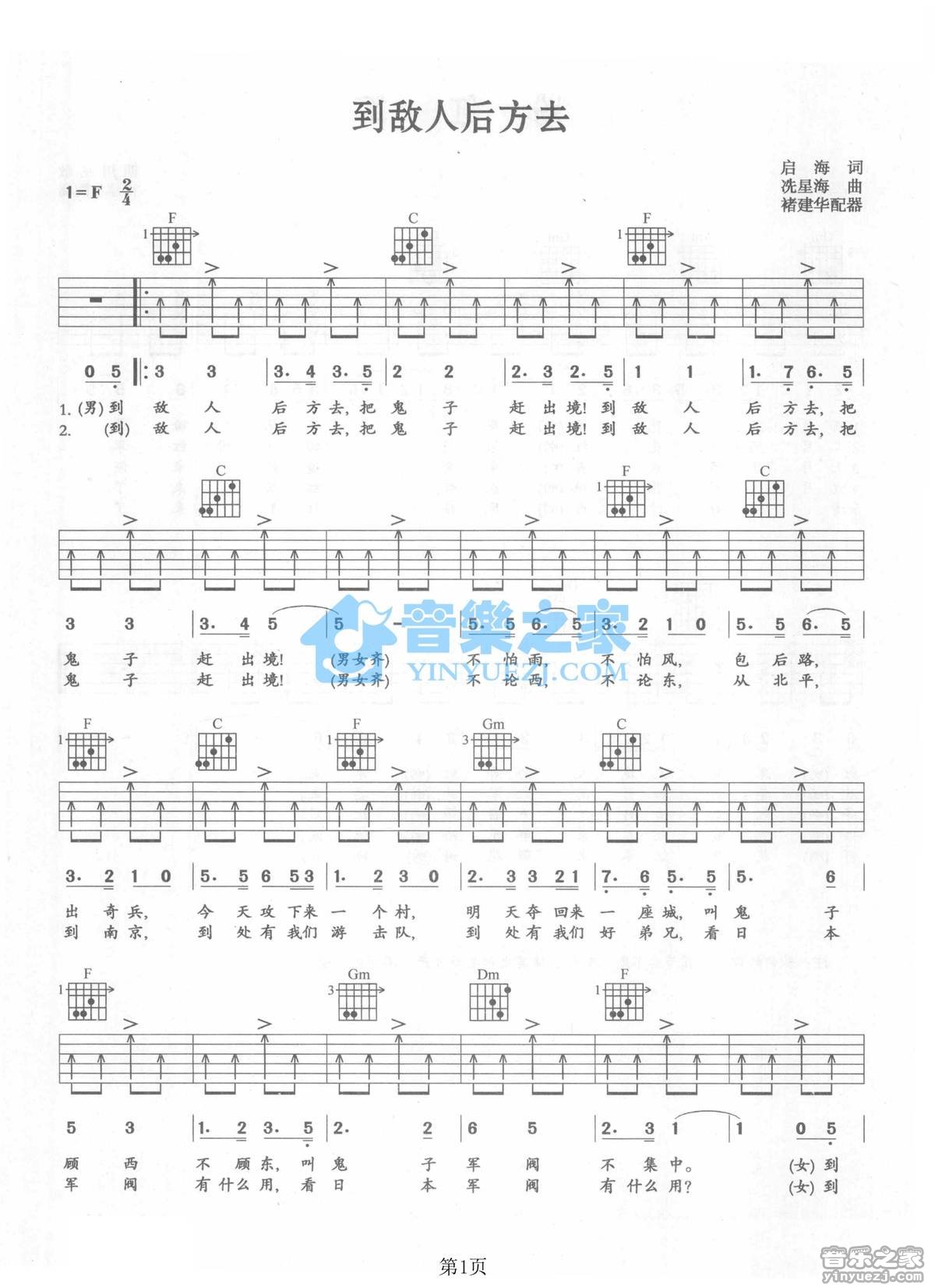 F调版抗战歌曲《到敌人后方去》吉他弹唱六线谱...