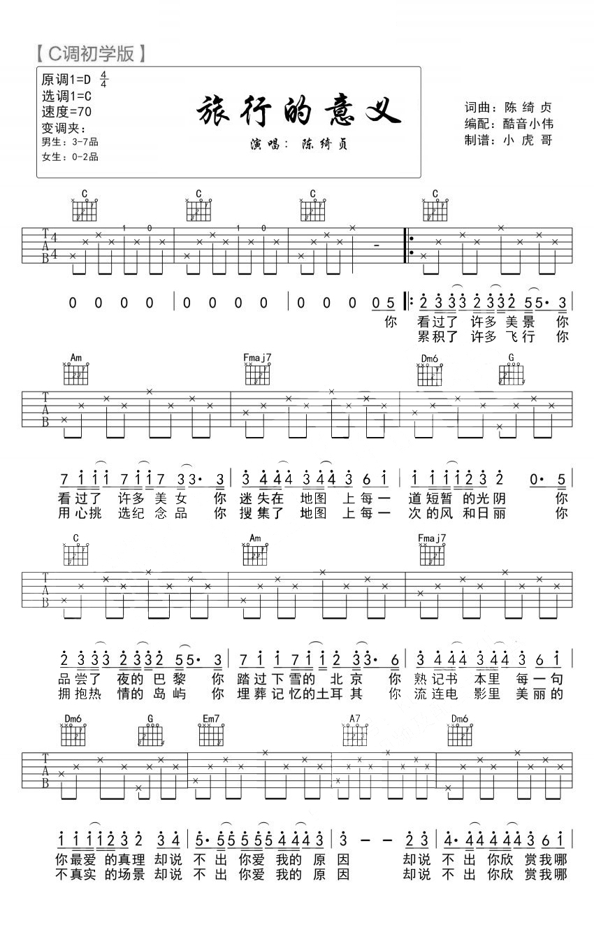 陈绮贞《旅行的意义》吉他谱,原调D选调C调,为初学版曲谱编配,琴友们根据自己音域选择变调夹位置。在路途中思念,在远方时回望,低吟浅唱心底曾经热爱的旋律,那一如往昔的记忆,电影幕布般影印,播放出你在我心里的美丽。...