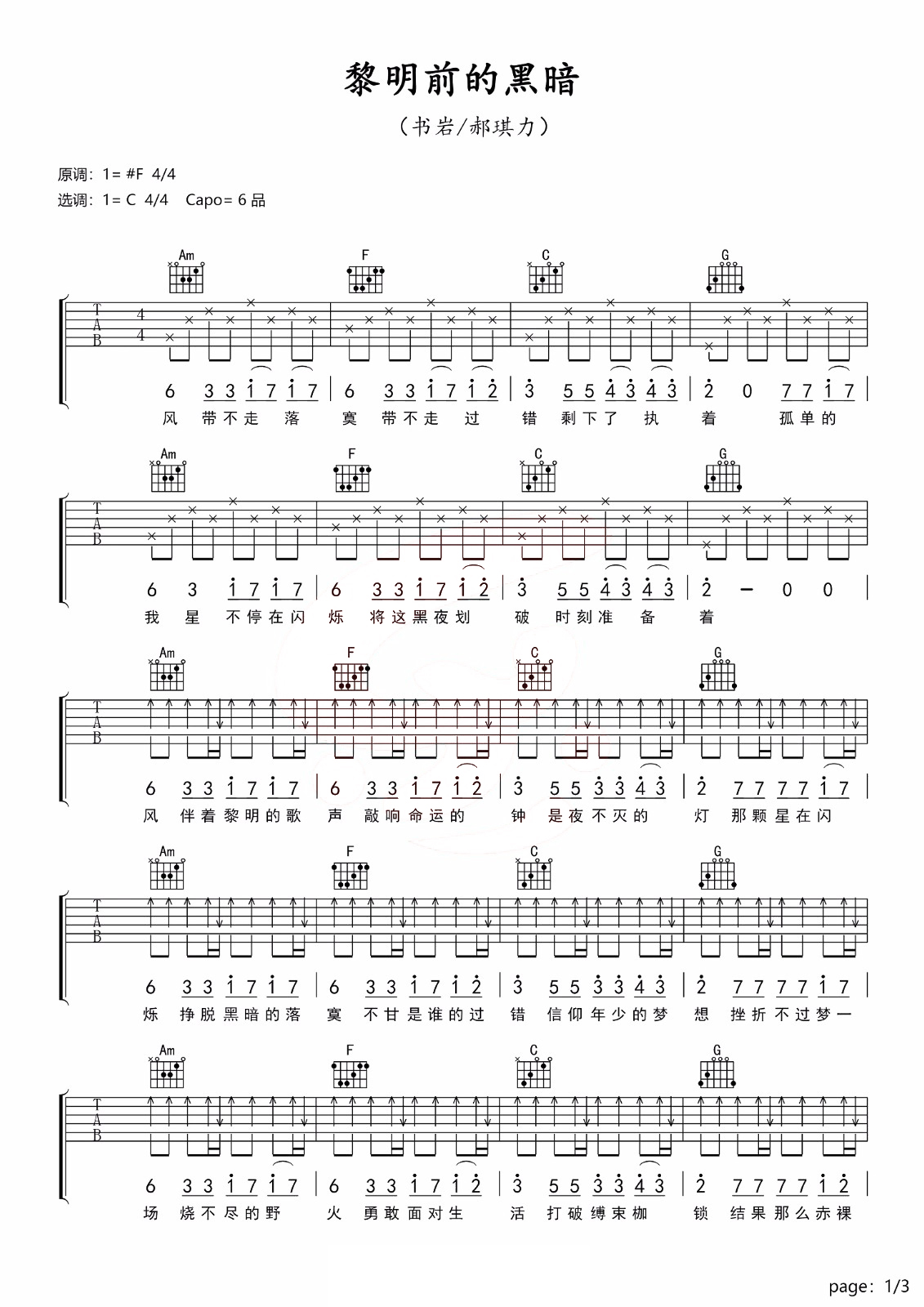 吉他书岩/郝琪力《黎明前的黑暗》吉他谱 - 乐事吉他编配