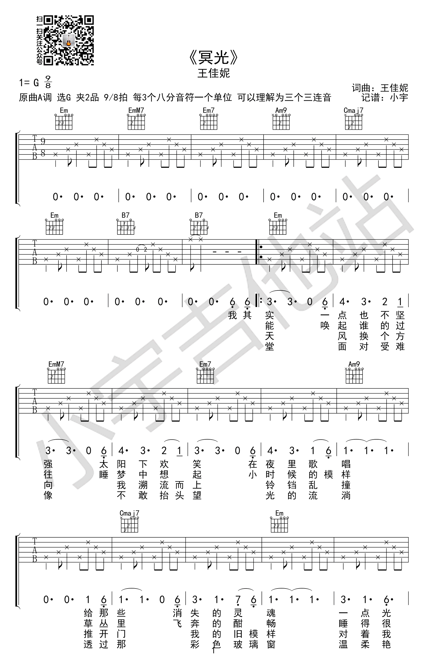 王佳妮《冥光》吉他谱,原曲A调,选用G调,夹二品变调夹。音乐人王佳妮的一首民谣歌曲,当我们辗转迷失在青春的迷墙中,宁静理智却爱意暗涌的歌声,会将坚定的意志和轻盈的温柔传递。...
