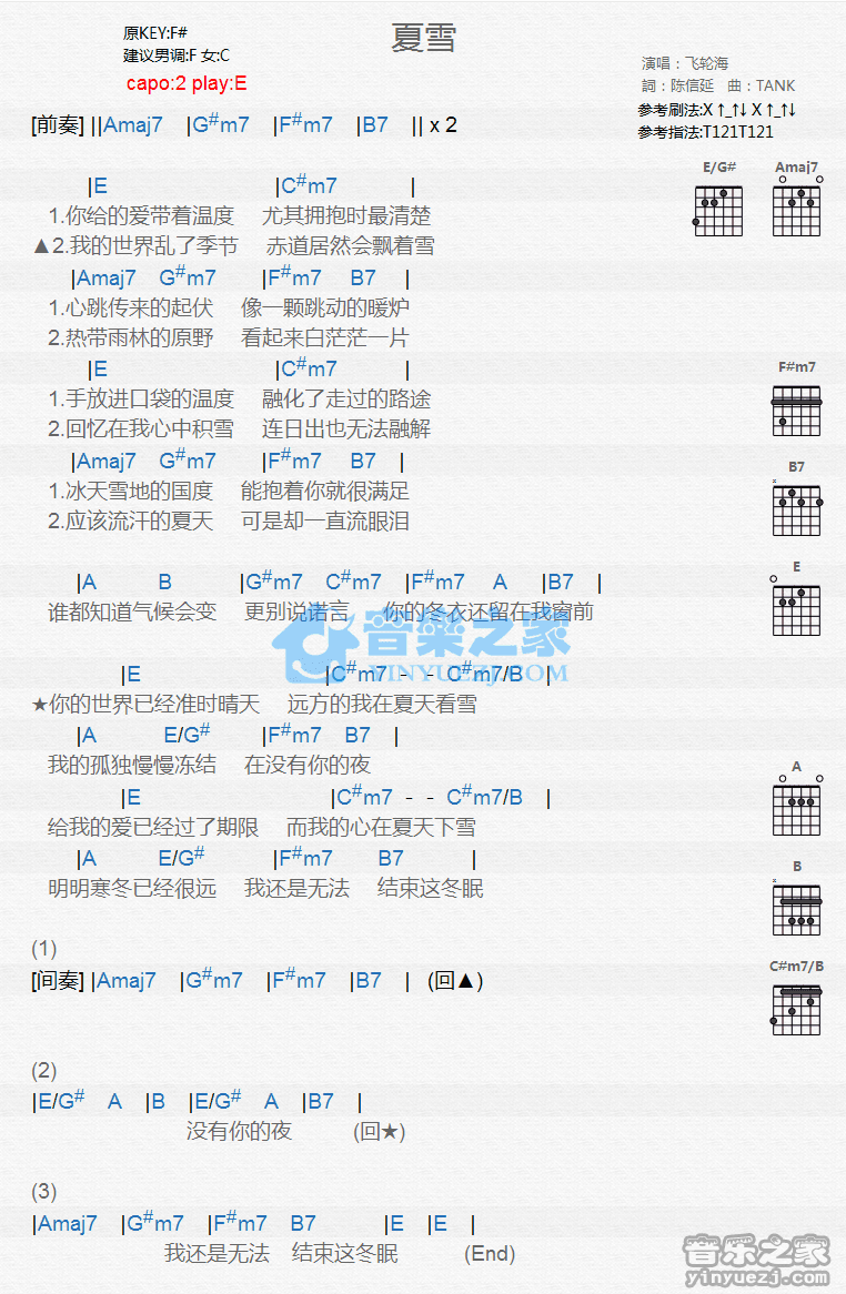 E调版飞轮海《夏雪》吉他和弦弹唱谱...