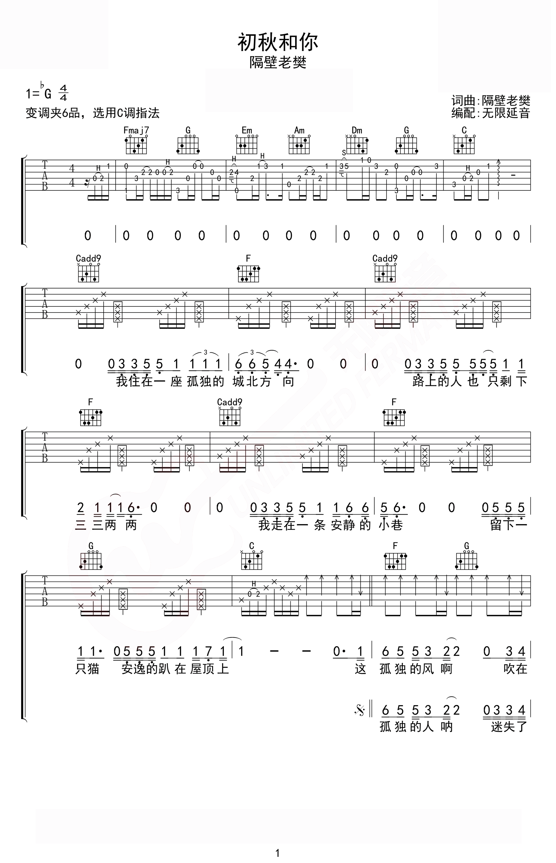 《初秋和你》吉他谱,隔壁老樊演唱,原调降G,选用C调指法编配,变调夹六品。落叶纷飞的秋日,慵懒趴在屋顶上的猫咪,现实的漫长距离,一点点滋生的牵挂和想念,孤独在我们心里悄无声息的蔓延。隔壁老樊沧桑的声线唱出孤独的日子里的思念,歌词充满着秋天的感觉和对曾经旧时光的回忆,从年少一往无前...