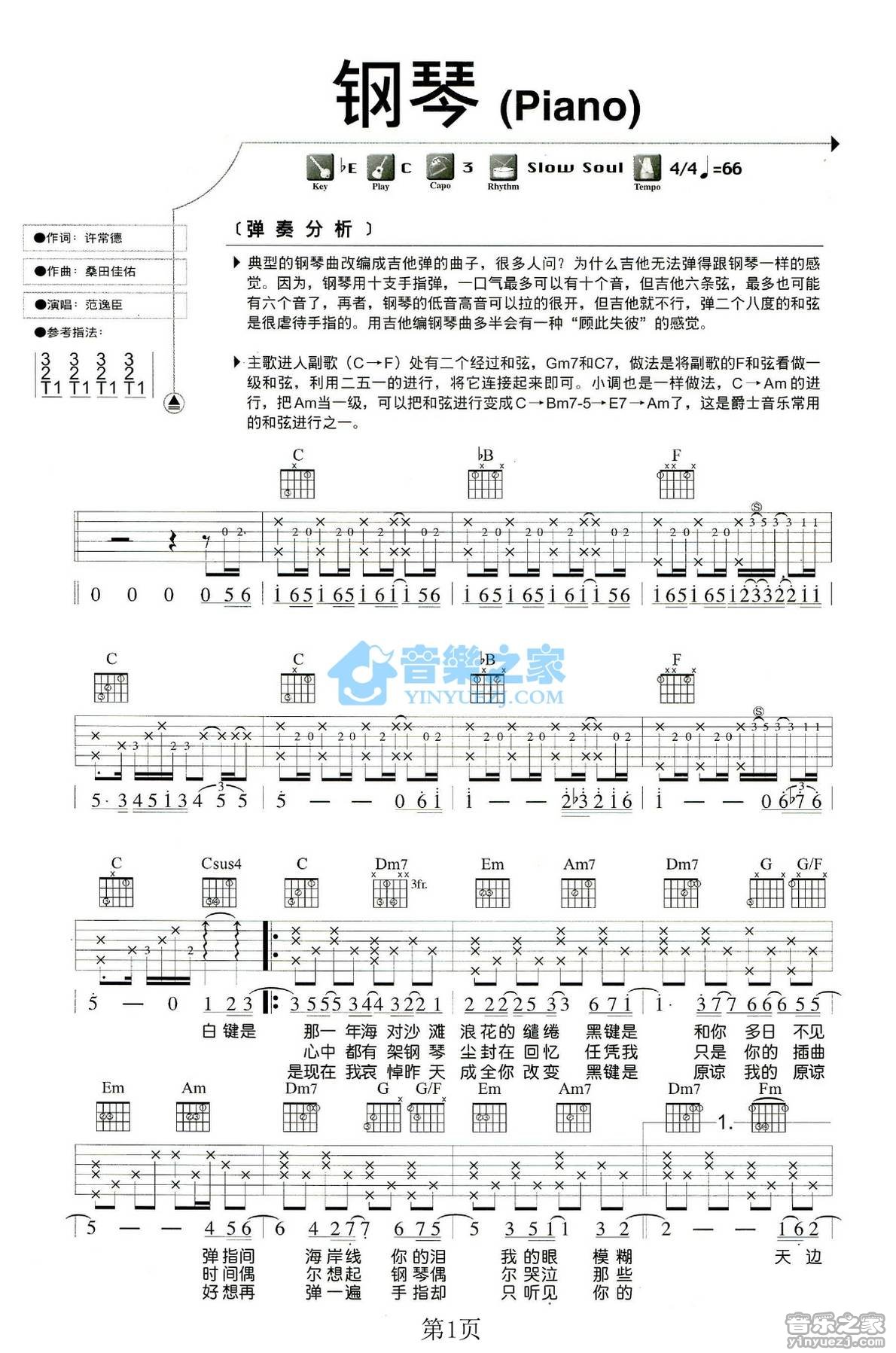 C调版范逸臣《Piano》吉他弹唱六线谱...