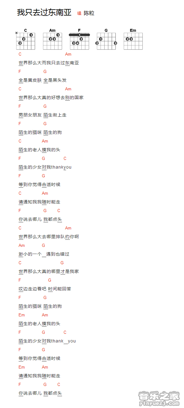 陈粒《我只去过东南亚》吉他谱,YYZJ编配出品,共有1张高清图谱,免翻页排版设计。...