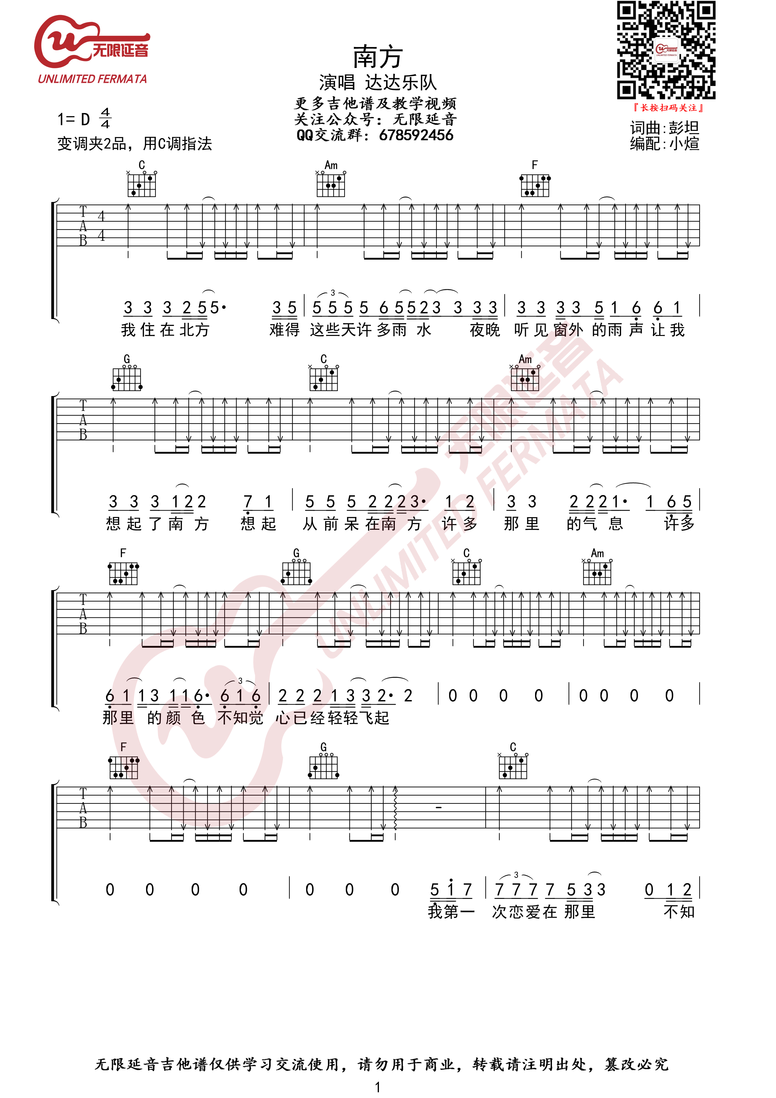 达达乐队《南方》吉他谱,无限延音编配出品,共有4张高清图谱。...