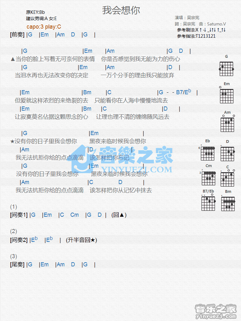 C调版吴宗宪《我会想你》吉他和弦弹唱谱...