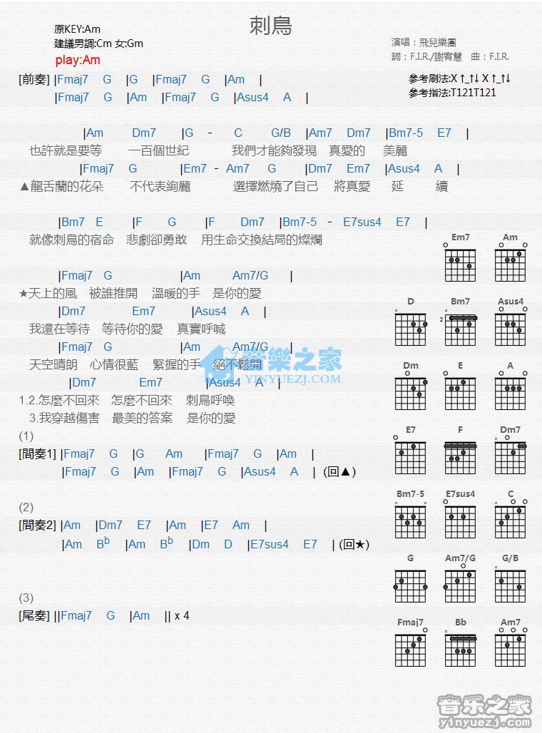 Am调版《刺鸟》吉他和弦弹唱谱...