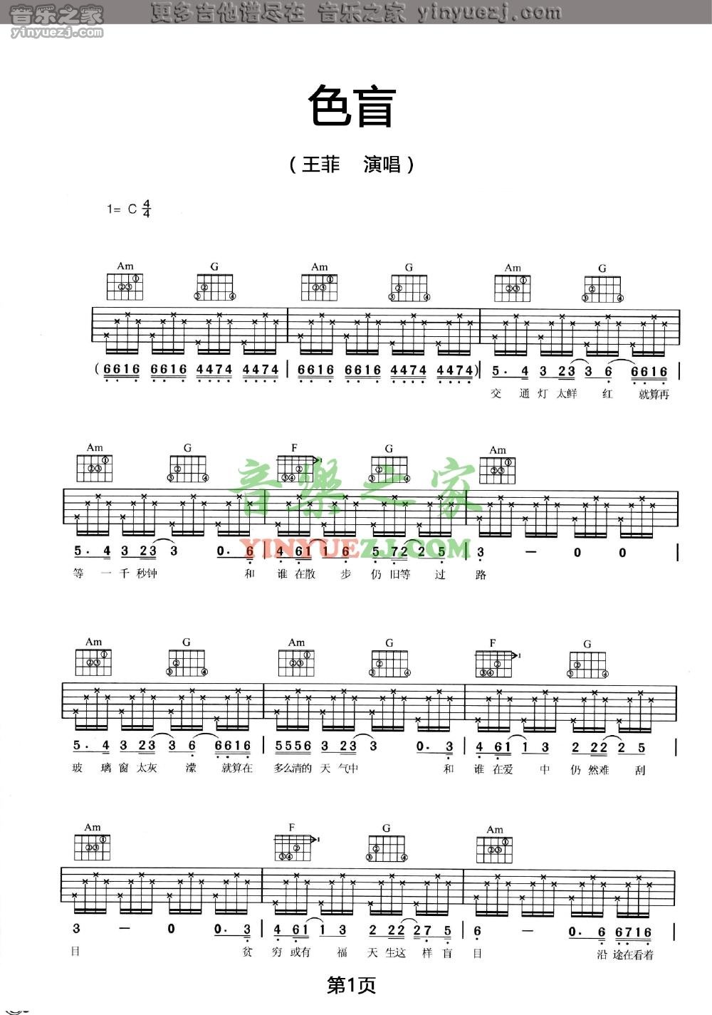 王菲《色盲》吉他谱,YYZJ编配出品,共有3张高清图谱。...