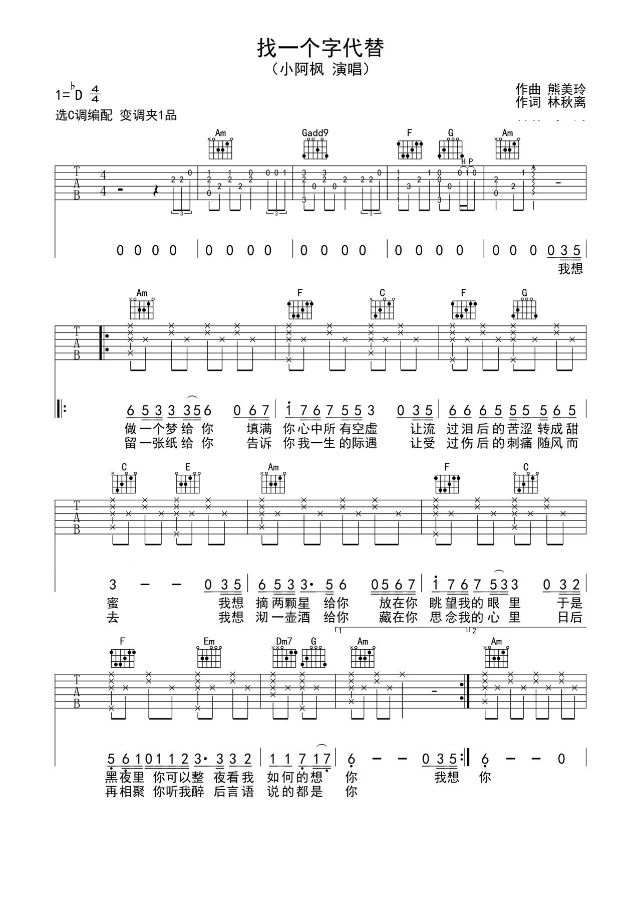 吉他邰正宵/小阿枫《找一个字代替》吉他谱