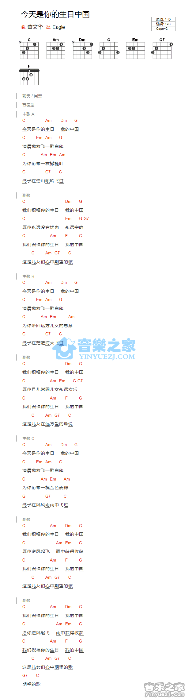 C调版董文华《今天是你的生日中国》吉他和弦弹唱谱...