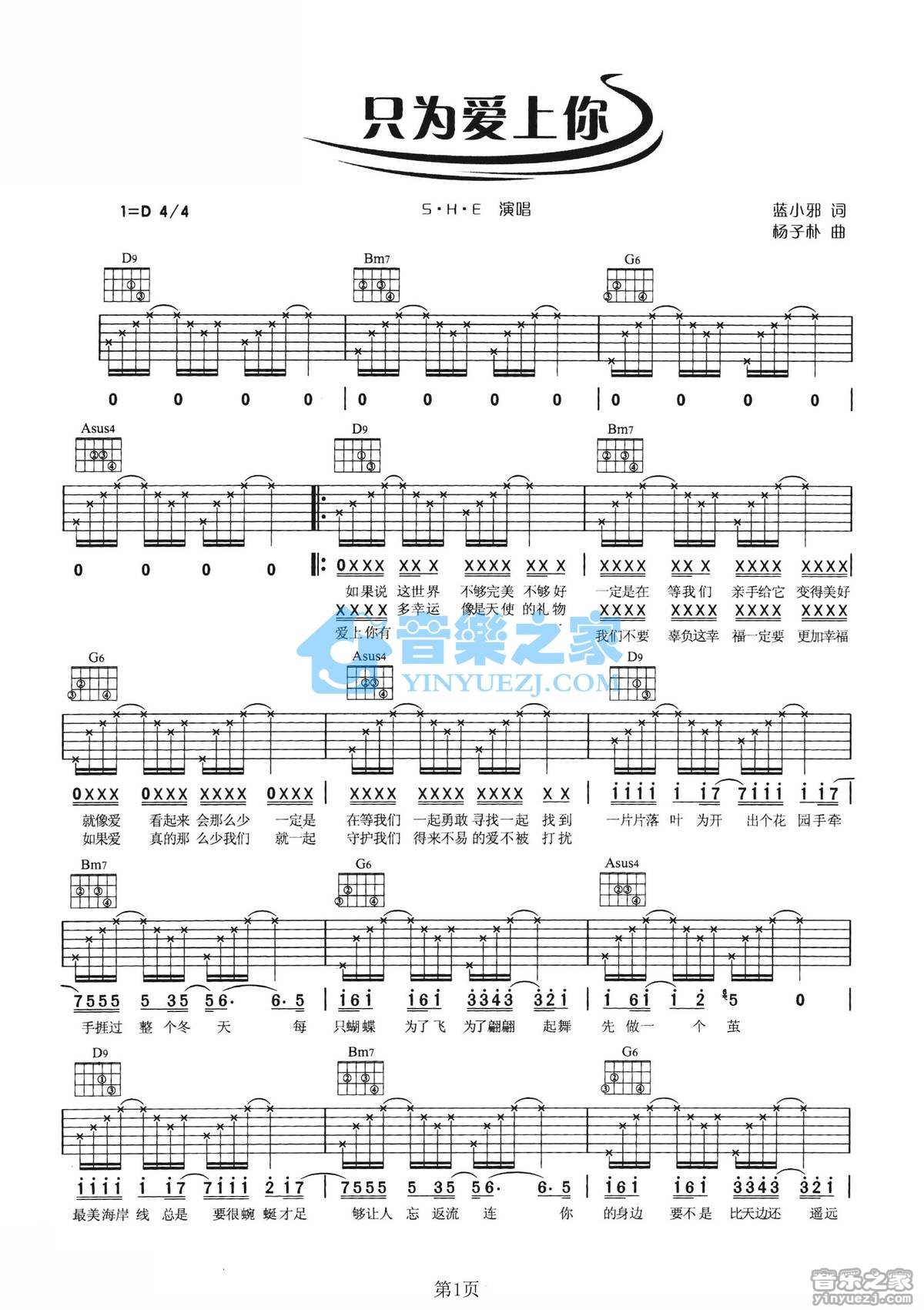 D调版S.H.E《只为爱上你》吉他弹唱六线谱...