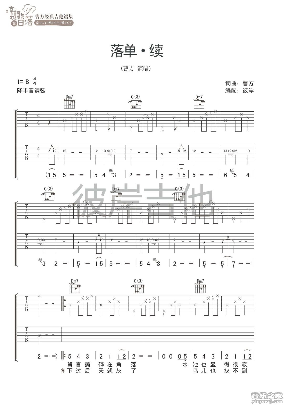 B调《落单续》吉他弹唱六线谱...