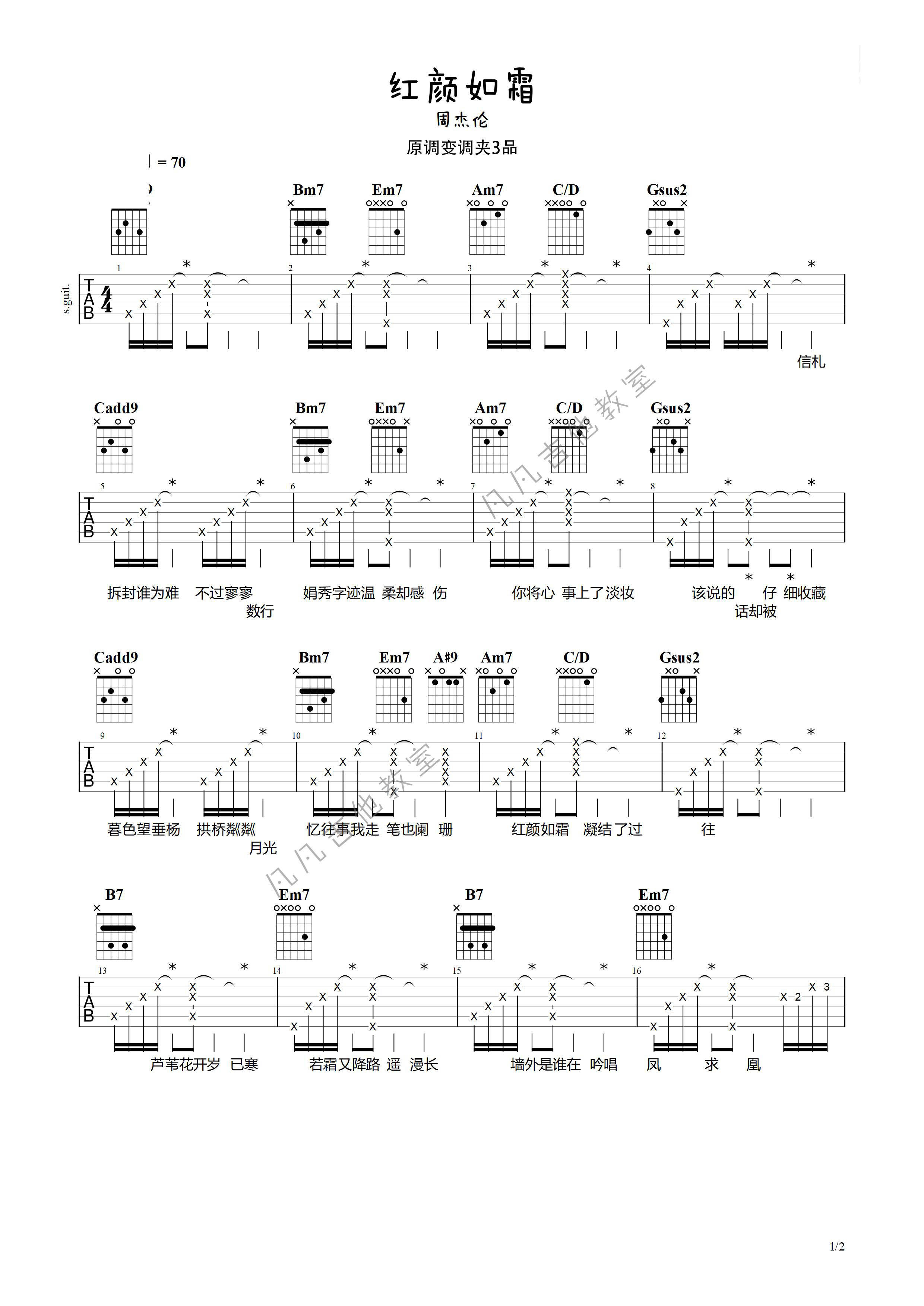 周杰伦《红颜如霜》吉他谱,共有2张高清图谱,免翻页排版设计。...