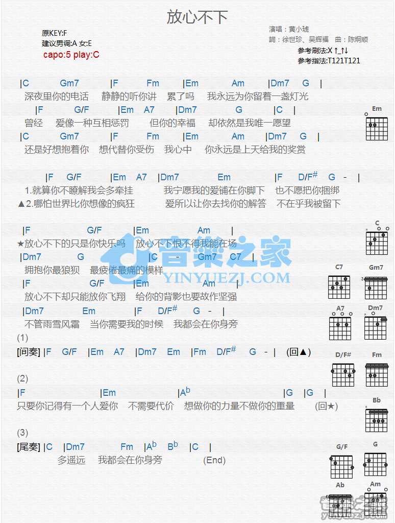 C调版黄小琥《放心不下》吉他和弦弹唱谱...