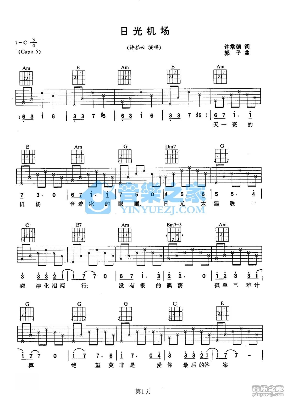 C调版许茹芸《日光机场》吉他弹唱六线谱...