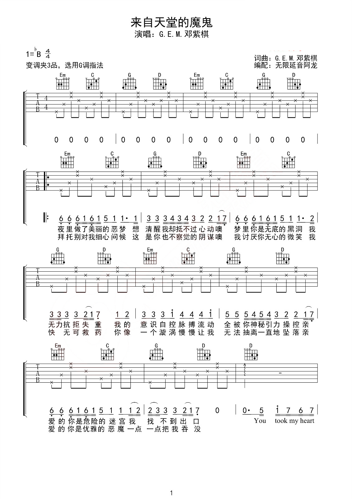 吉他邓紫棋《来自天堂的魔鬼》吉他谱 - 推荐版本