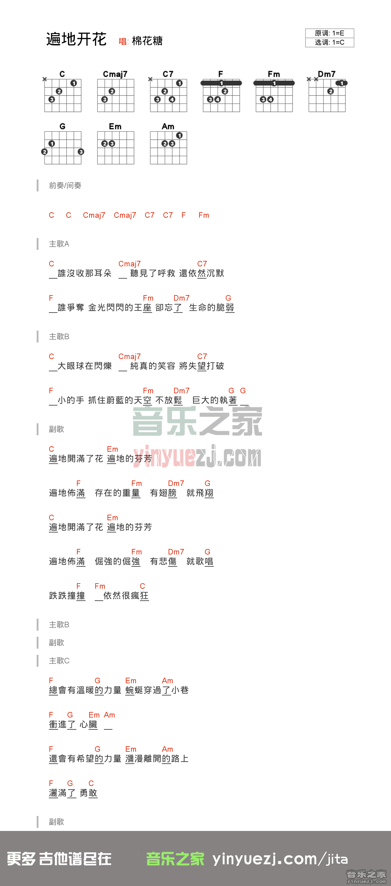 棉花糖《遍地开花》吉他谱,共有1张高清图谱,免翻页排版设计。...