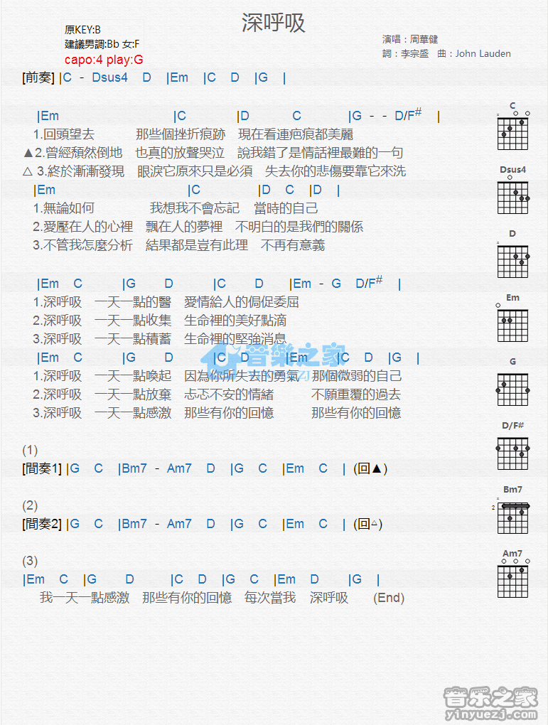 G调版《深呼吸》吉他和弦弹唱谱...