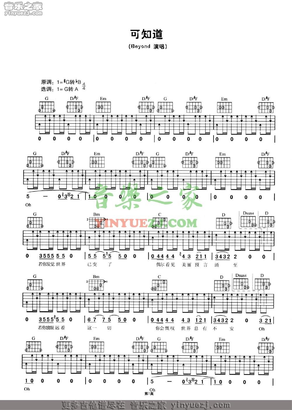 Beyond《可知道》吉他谱,YYZJ编配出品,共有4张高清图谱。...