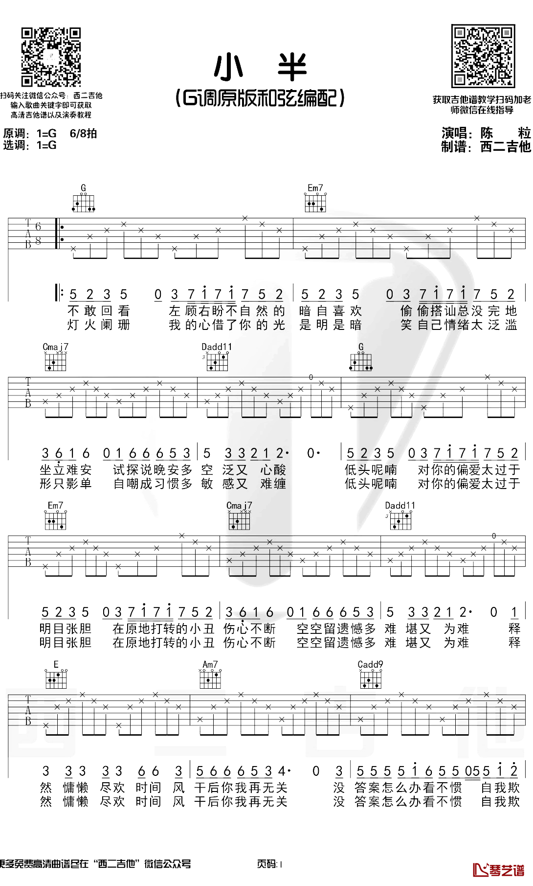 小半吉他谱,采用G调原版和弦编配,小半弹唱六线谱,需要注意的是这首歌是6/8拍的节奏,需要多加练习才能稳定的演奏出来,边弹边唱还是有一点点难度的,下面来看一下火山老师的演奏视频吧!这是一首陈粒演唱的一首代表民谣歌曲--你明目张胆的偏爱就是救赎。传递的大概是,我喜欢你,怕你知道,又...