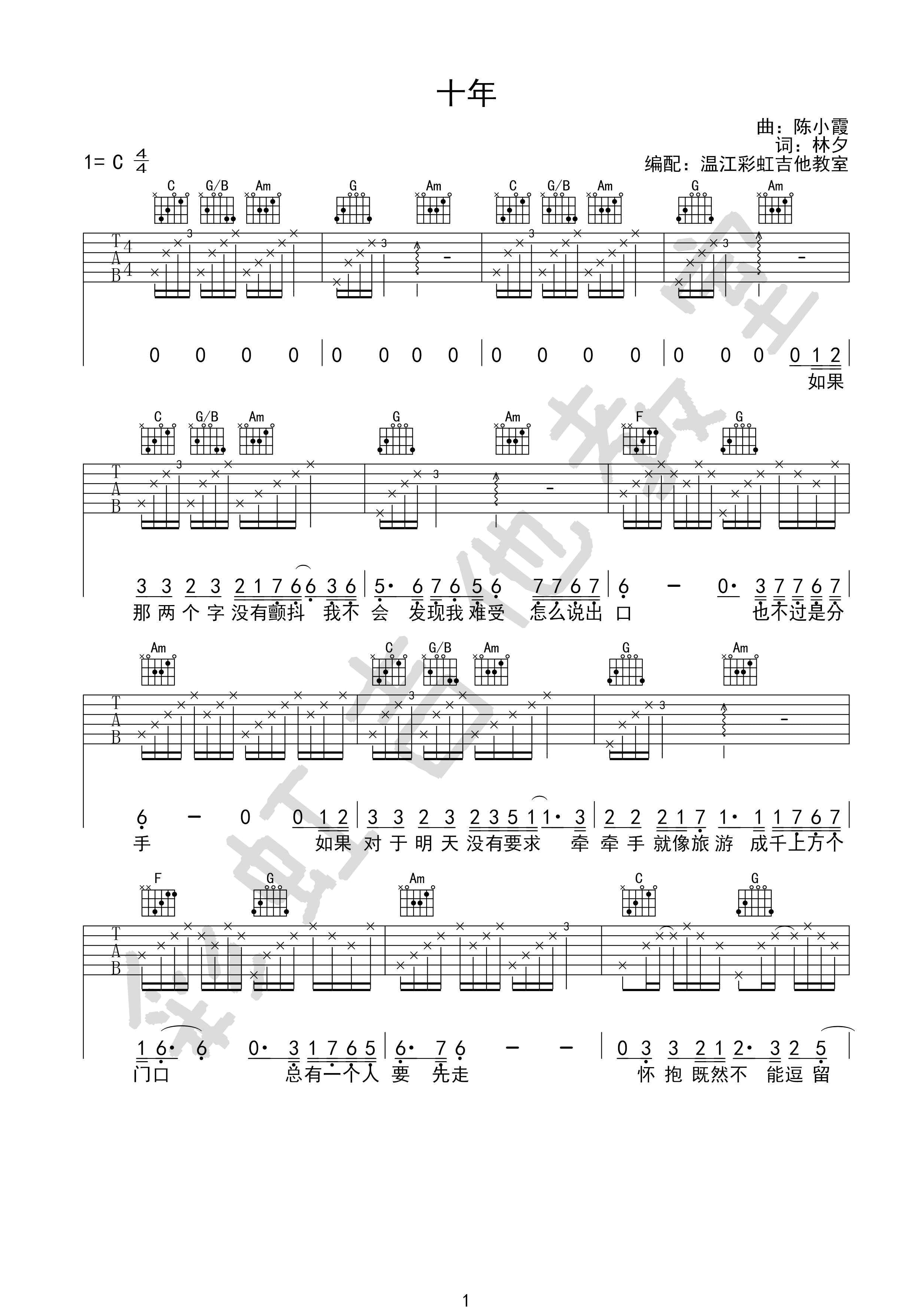 陈奕迅《十年》吉他谱,彩虹吉他教室编配出品,共有2张高清图谱,免翻页排版设计。...