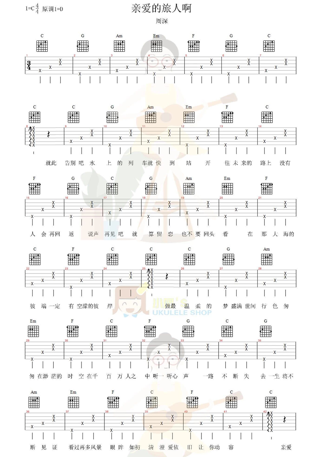 吉他周深《亲爱的旅人啊》吉他谱 - 很多人都在弹的版本