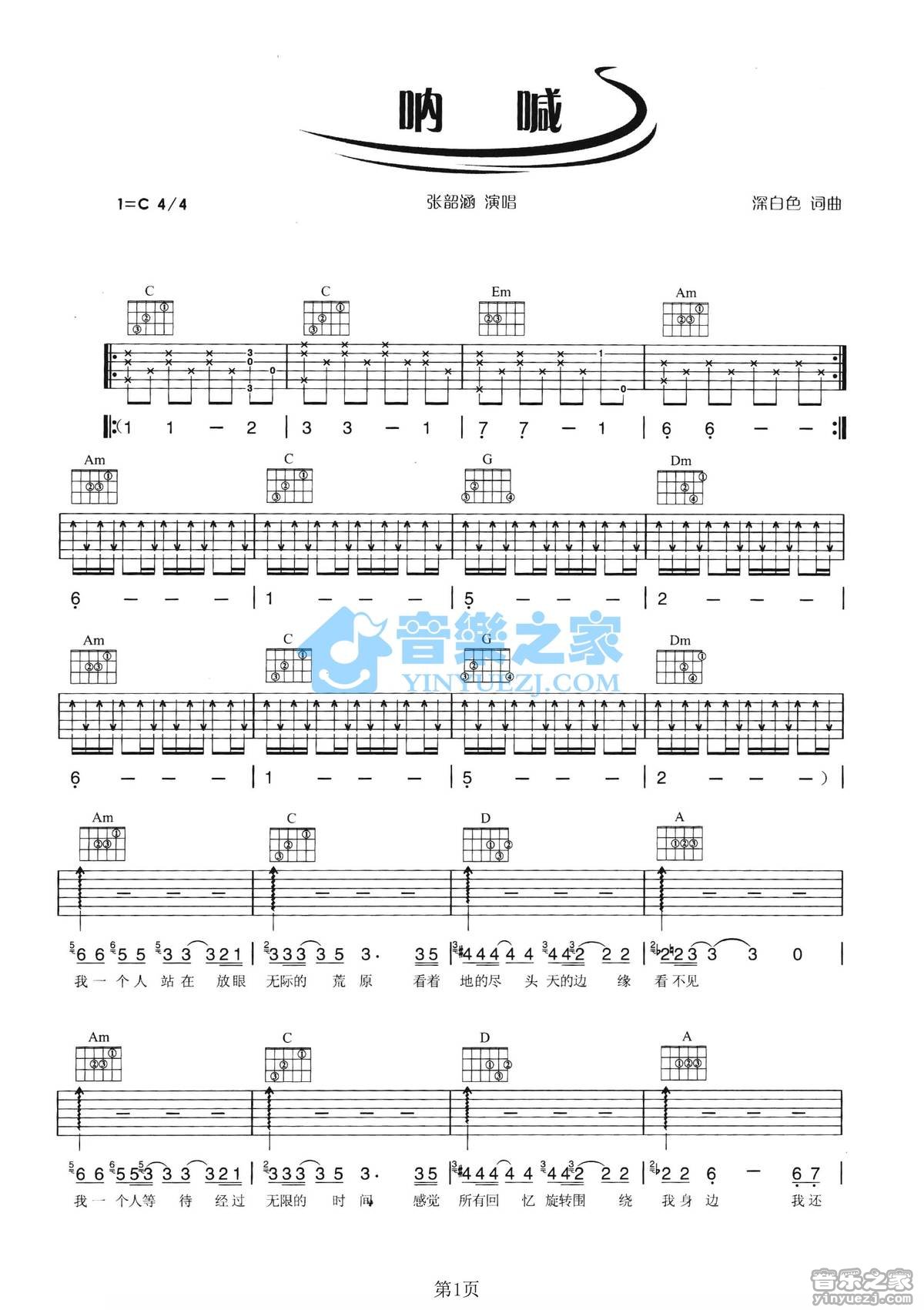C调版《呐喊》吉他弹唱六线谱...
