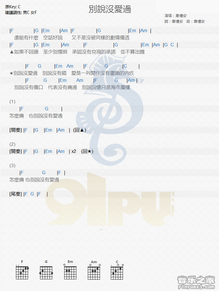 C调版《别说没爱过》吉他和弦弹唱谱...