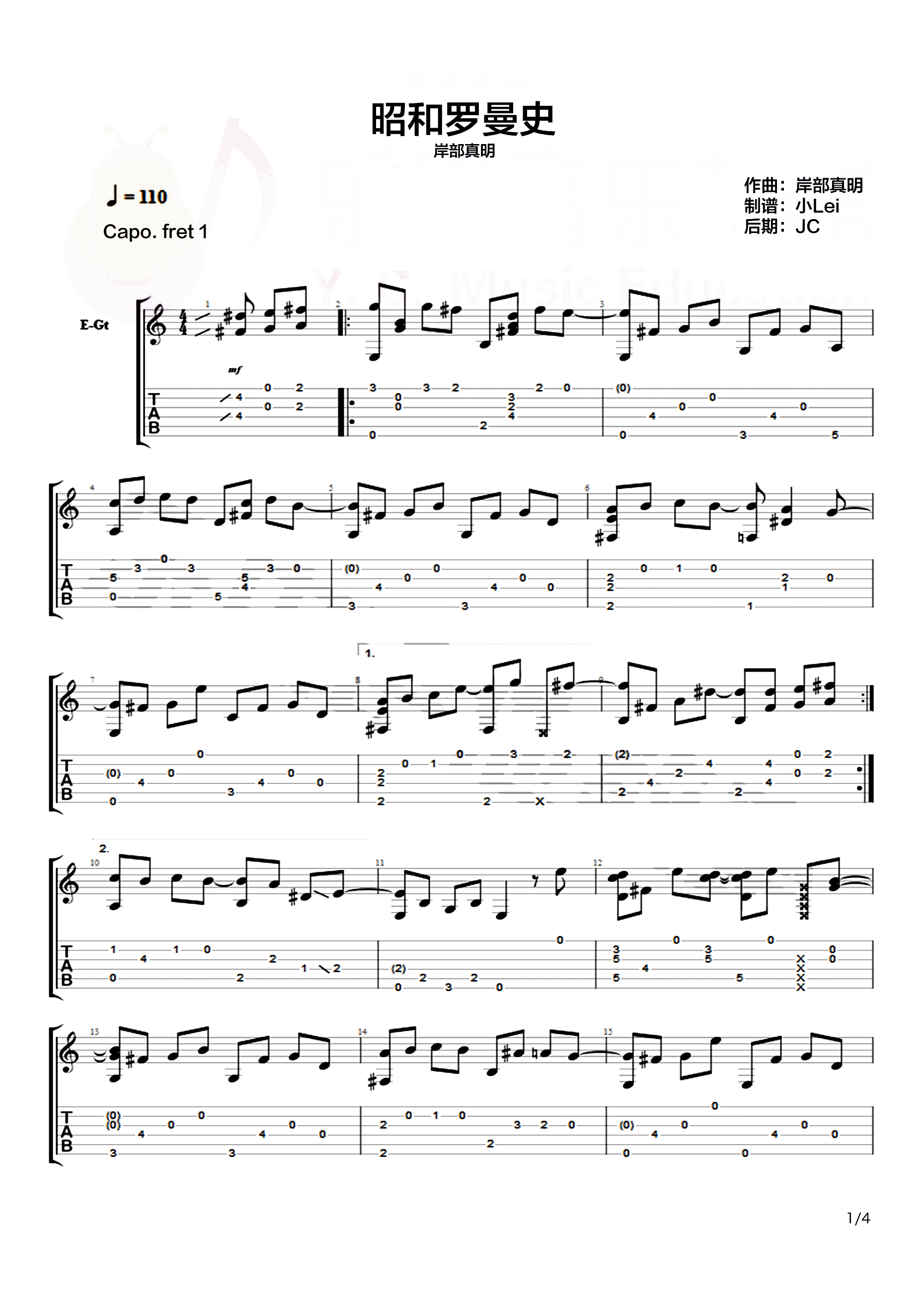 CAPO夹一品,随谱附上《昭和罗曼史》指弹吉他视频,大家参照演示学习。这首旋律优美浪漫的曲子,来自于岸部真明2013年新专辑里,一首难得不用特殊调弦的曲子《昭和罗曼史》,非常喜欢,相信通过这首曲子的练习琴友们感觉到节奏和右手重要性。...